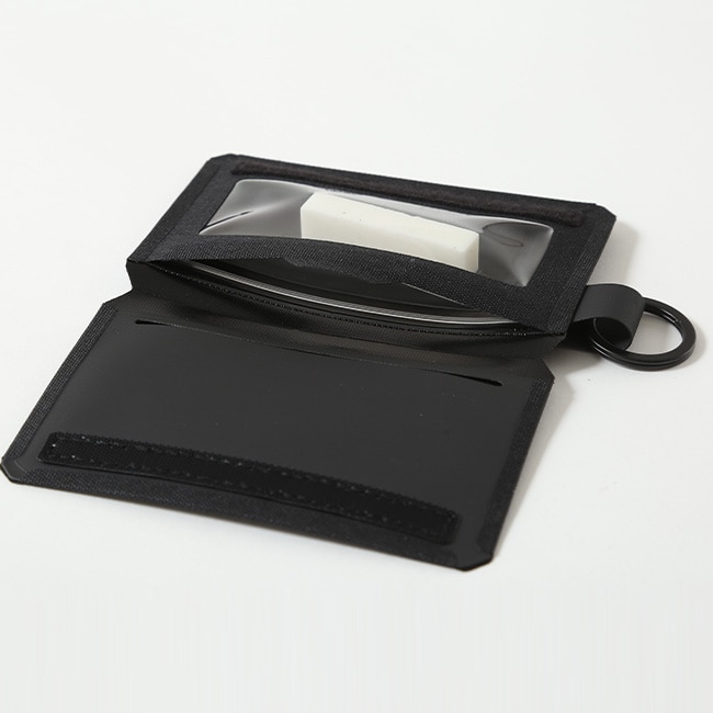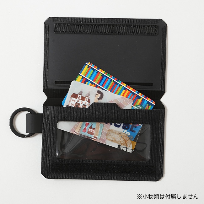 素材には、環境に配慮したリサイクルポリエステルを使用しています。面ファスナーで開閉できる内側に、カードホルダー、クリアポケットを設置。