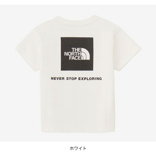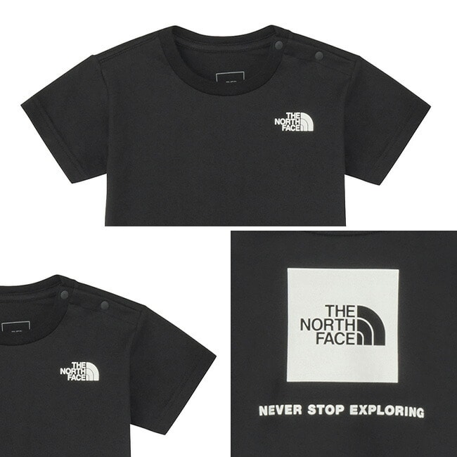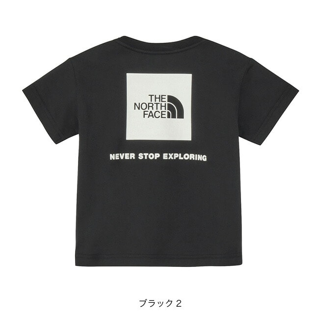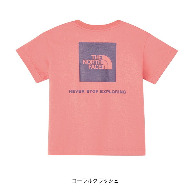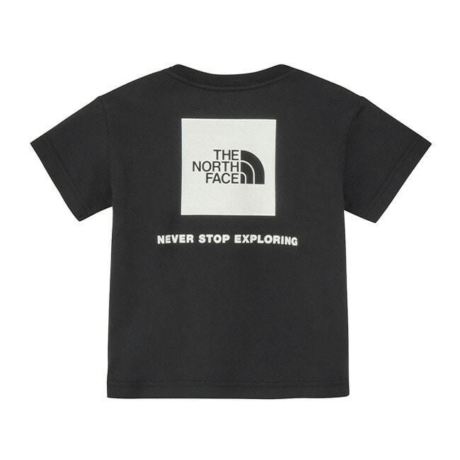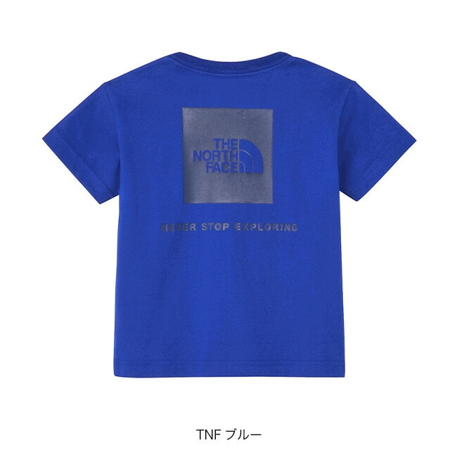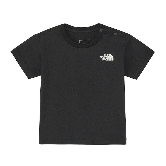 背面に大きなスクエアロゴを配置した半袖Tシャツのベビーモデル