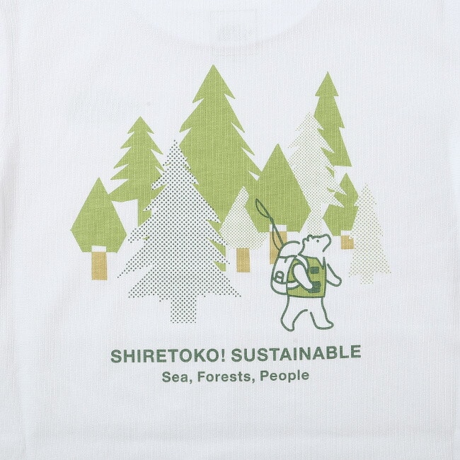 背面には、釣竿を携え大きなバックパックを背負ったトコさんが知床の森を歩く姿を描いた、物語性のあるグラフィックを大胆に配置しました。生地には、リサイクルポリエステルとオーガニックコットンを混紡した速乾性ニット素材を採用。