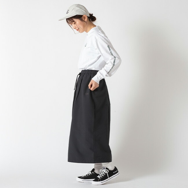 旅行やお出かけシーンで活躍する「Journeys(ジャーニーズ)」シリーズのロングスカート。ヴィンテージ加工を施した軽量ナイロン素材を使用し、持ち運びやすさとこなれた風合いを両立した一着です。