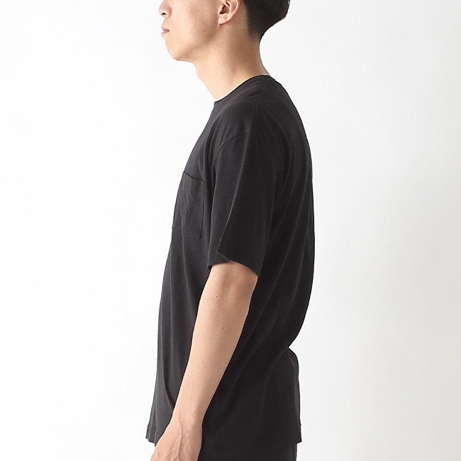 不要衣料の端材を回収したリサイクルレーヨンに、コットンを混紡した生地は、やわらかな肌触りとドレープ感が特徴です。左胸にポケットを配置。