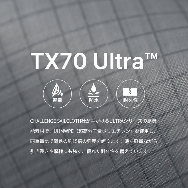 メイン素材に採用しているTX70 Ultra™は、CHALLENGE SAILCLOTH社が手がけるULTRAシリーズの高機能素材で、UHMWPE(超高分子量ポリエチレン)を使用し、同重量比で鋼鉄の約15倍の強度を誇ります。薄く軽量ながら引き裂きや摩耗にも強く、優れた耐久性を備えています。