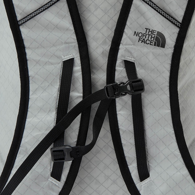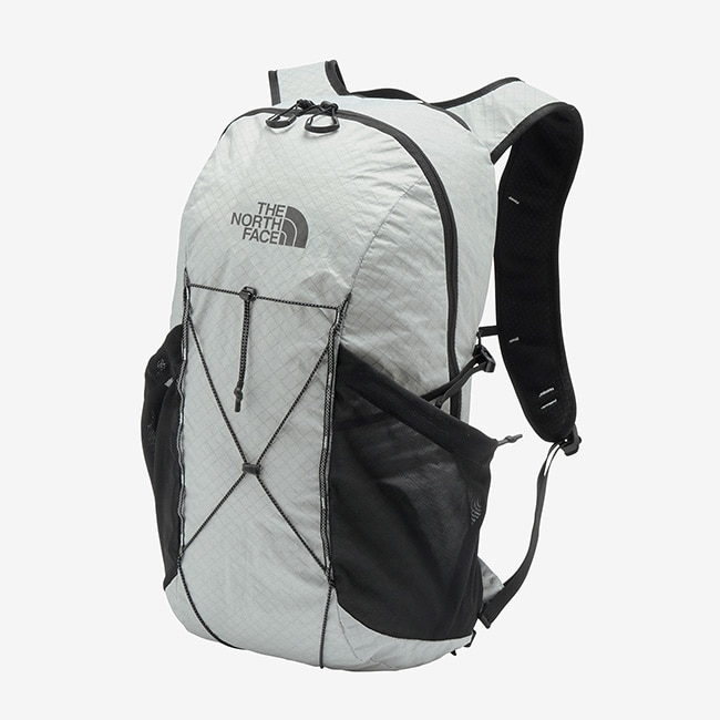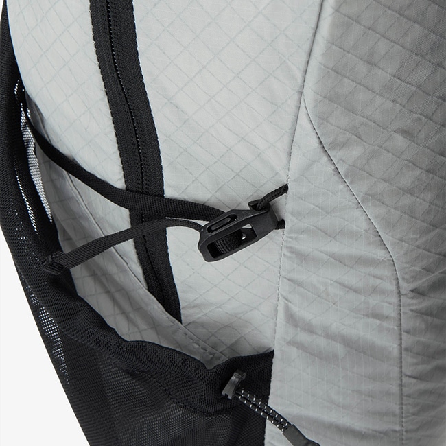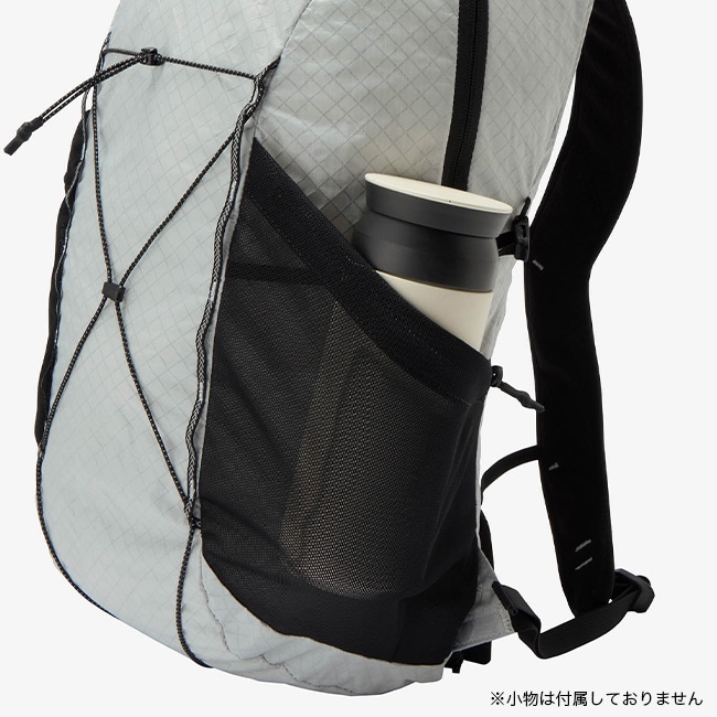 両サイドにはボトルやトレッキングポールを収納できるメッシュポケットを、フロントにはシェル、サンダル、薄手のテントマットまで外付け可能なバンジーコードを備えています。