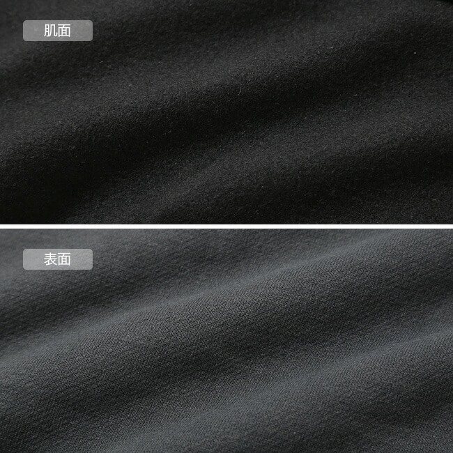 中厚手の裏毛生地は、乾きやすいポリエステル繊維を表に配置し、裏毛側には水分を含みにくいポリプロピレン繊維で構成。汗による濡れ感を軽減しながら速乾力を向上させています。