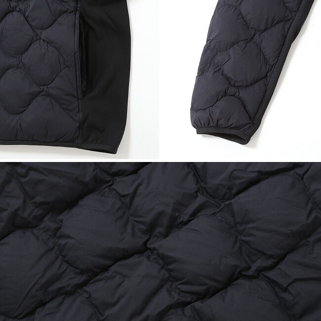 表地には防風性と通気性を備える「パーテックスカンタムエコ」を採用。中わたには2種類の形状を組み合わせた「プリマロフトサーモプルーム+」を封入し、高い保温性ながら軽くてやわらかな着心地です。