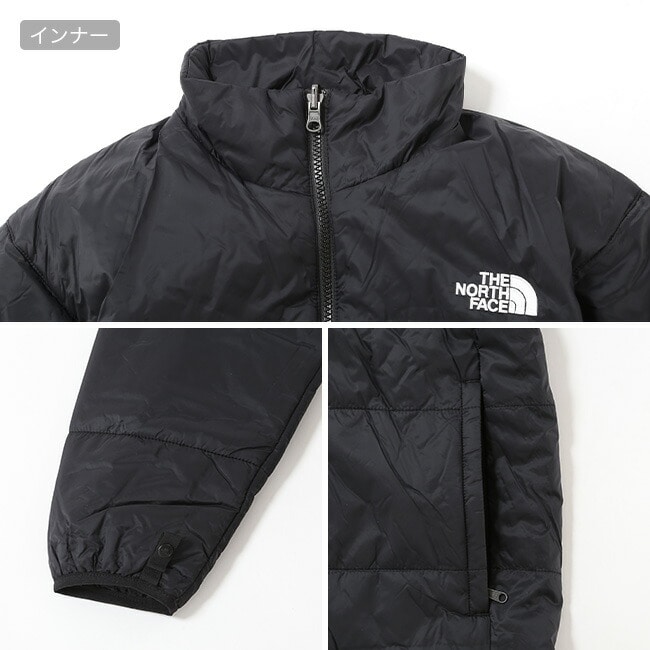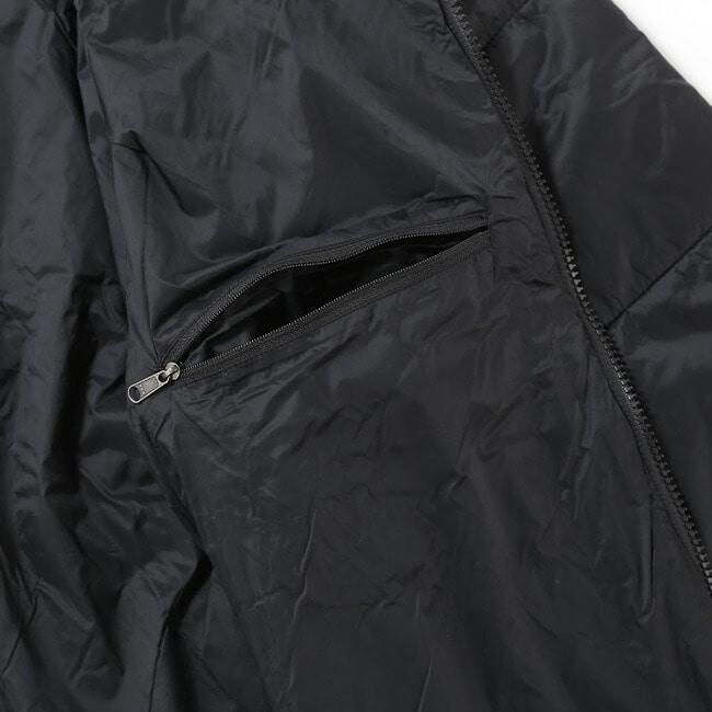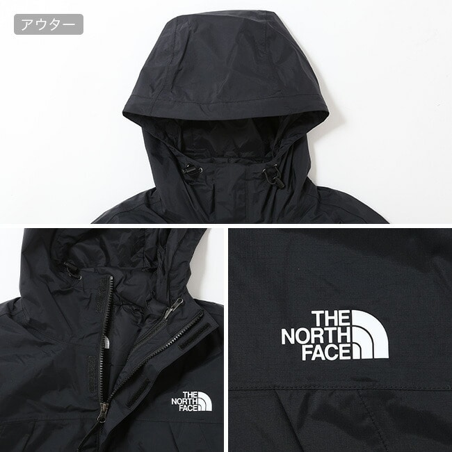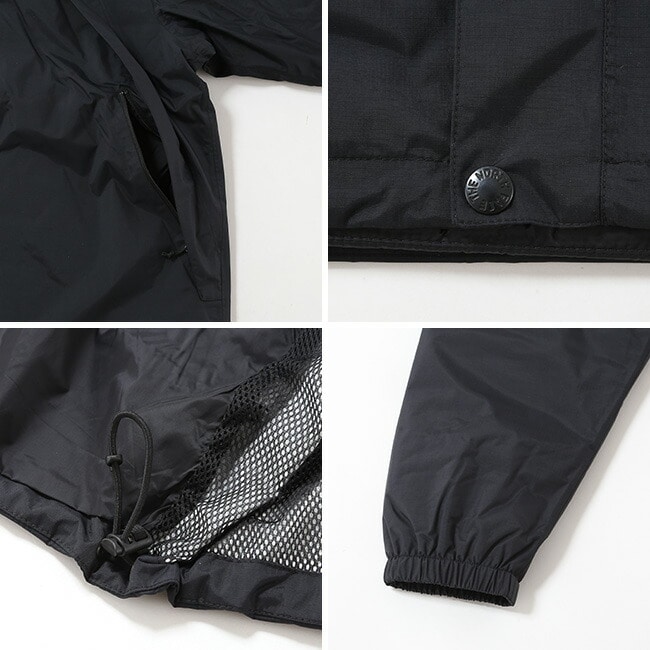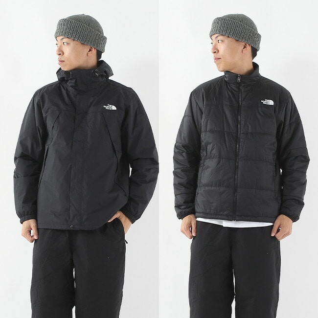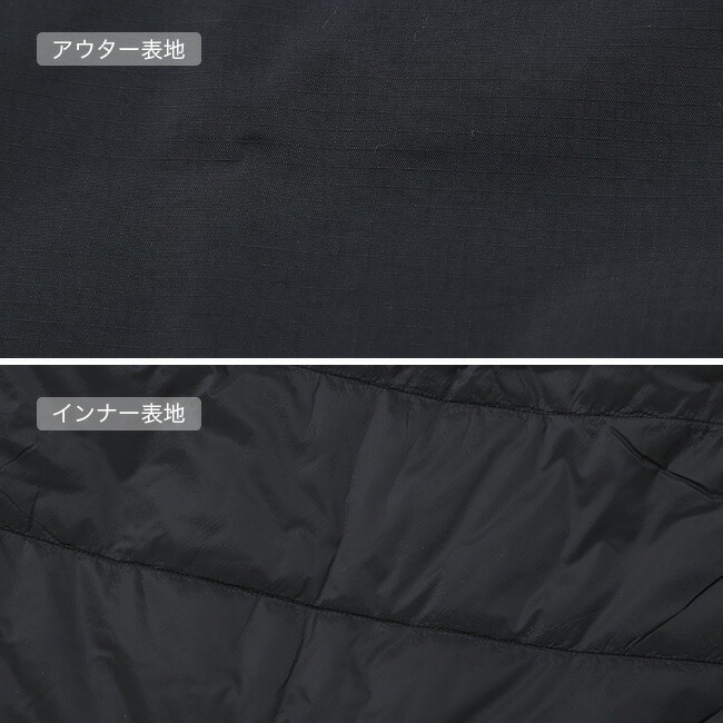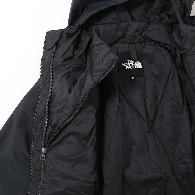 インナージャケットとアウターはフロント内部のファスナー袖口と首元のスナップボタンで連結して着用することも、それぞれを単体で使用することもできます。アウターは防水透湿性を持つ2層構造のナイロン素材を採用。