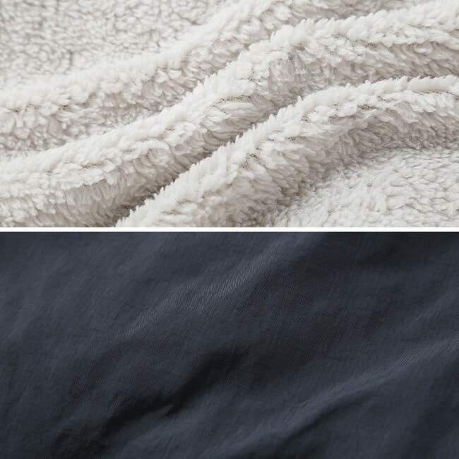 フリース面は毛足のあるシェルパフリース。布帛面は軽量のリップストップナイロン。