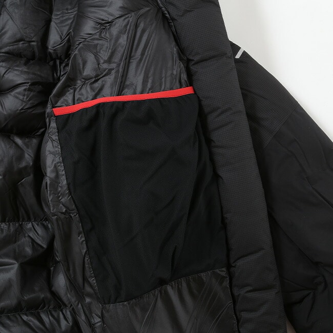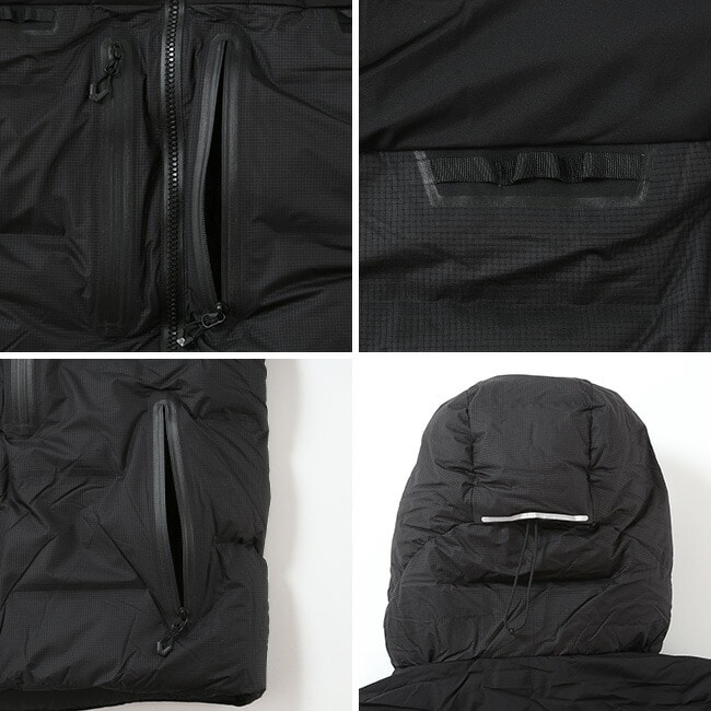 フードまわりは、高めに設計した前立てに加え、ダウン入りの襟とヘルメット対応の大きなフードが冷気の侵入を防ぎ、フィット感が良く視界を妨げない形に仕上げています。