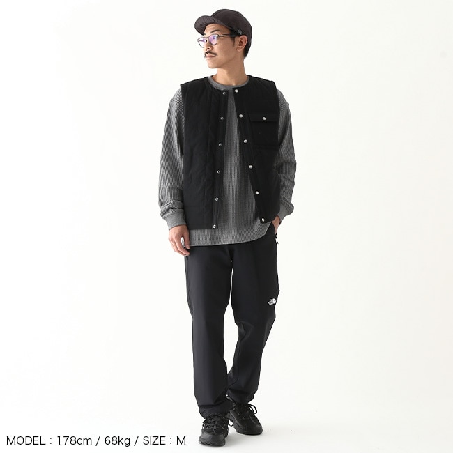 リサイクルナイロンとポリウレタンの混紡生地は高いストレッチ性を持ち、ニットのような伸縮性と着心地のよさが特徴です。ややテーパードのシンプルなデザインで、スッキリした印象に。