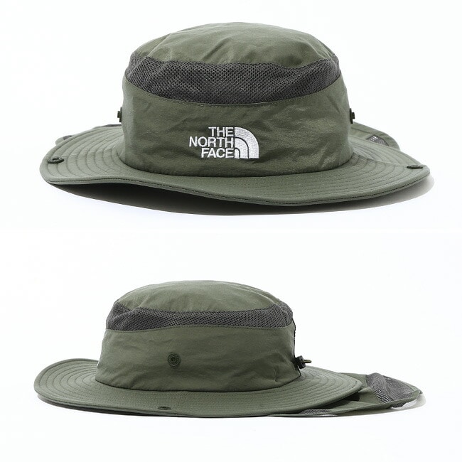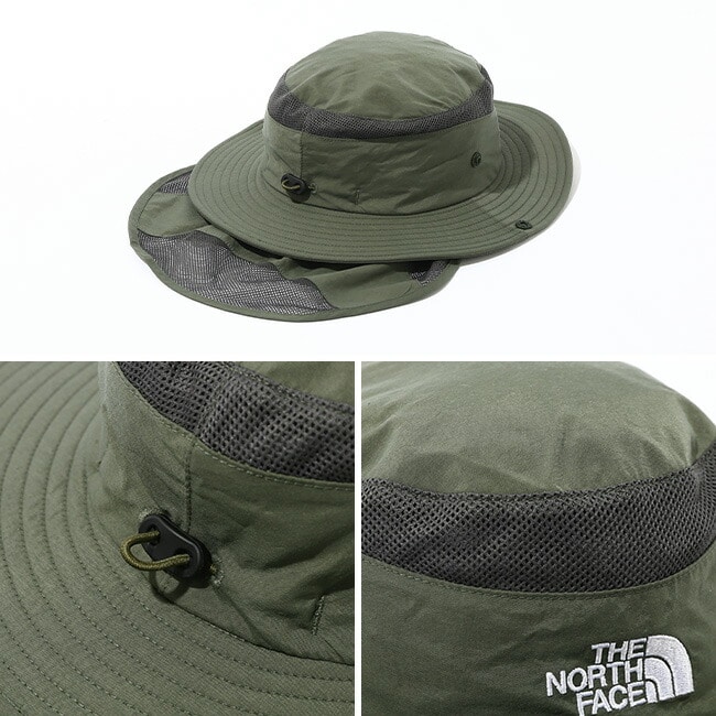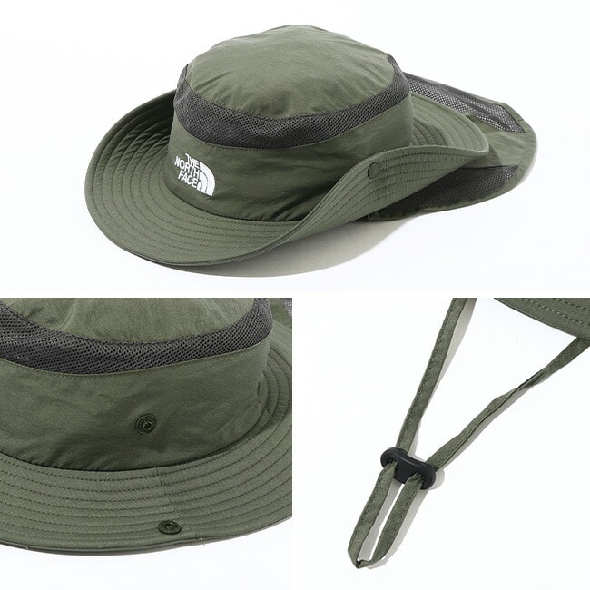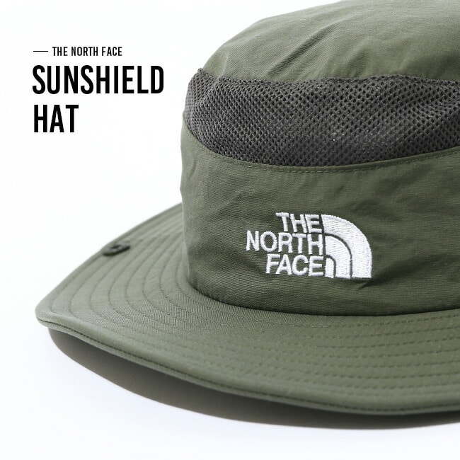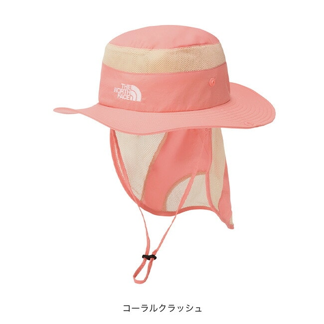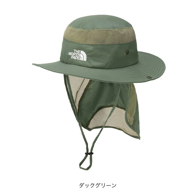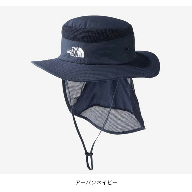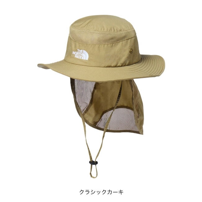 フックで簡単に取り外せるサンシールドは、首まわりの日焼け対策に有効。本体には、はっ水加工を施した軽量なナイロン素材を使用しています。