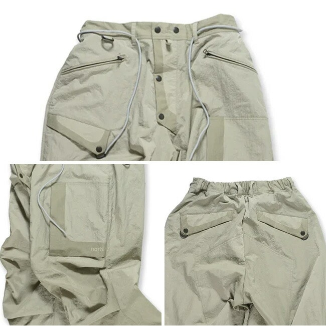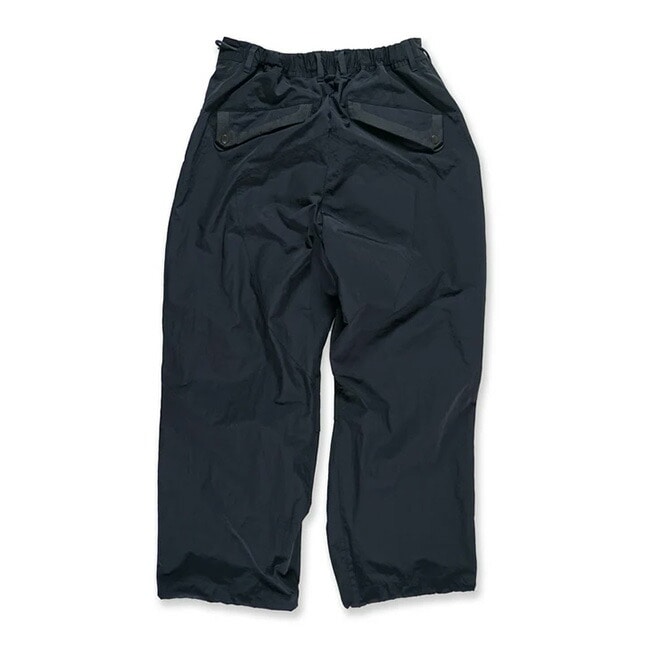 W/R 100%リサイクルナイロン(パウダータッチの塩縮ナイロン)使用のパンツ。ウエストのクロス付けのドローコード、ポケット入り口部に補強用プリントをデザインアクセントとして採用。
