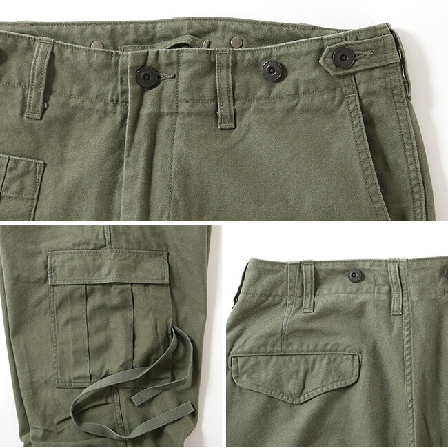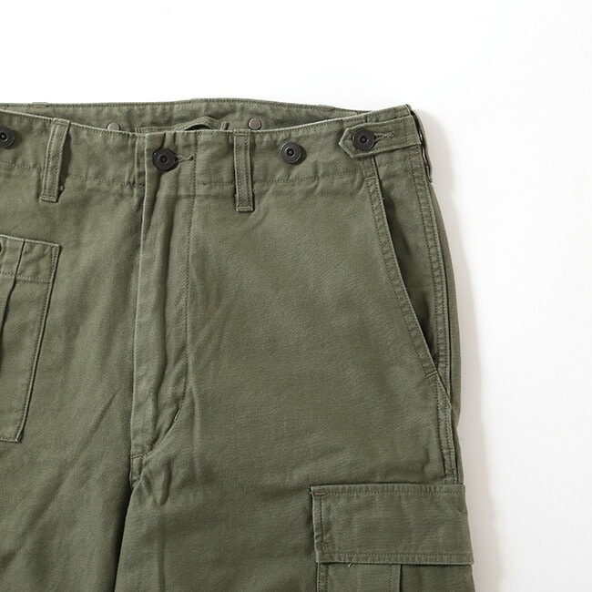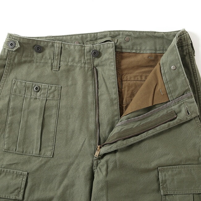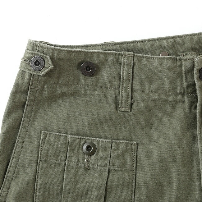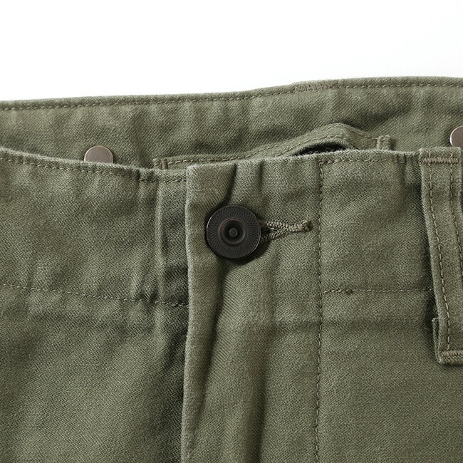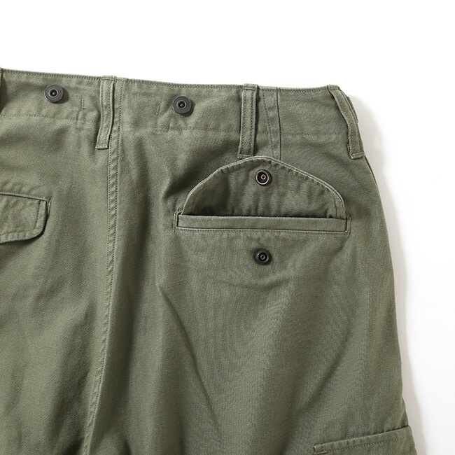 米軍のM-43と、カーゴパンツの傑作M-51、そして英国陸軍のビンテージをミックスしたデザインです。ファブリックはバックサテン。