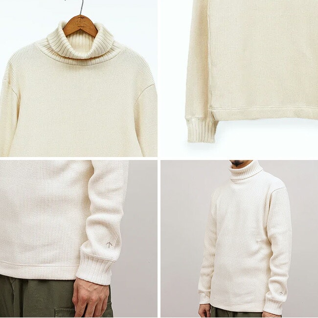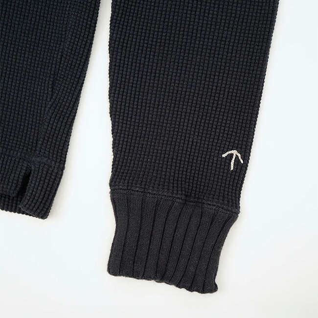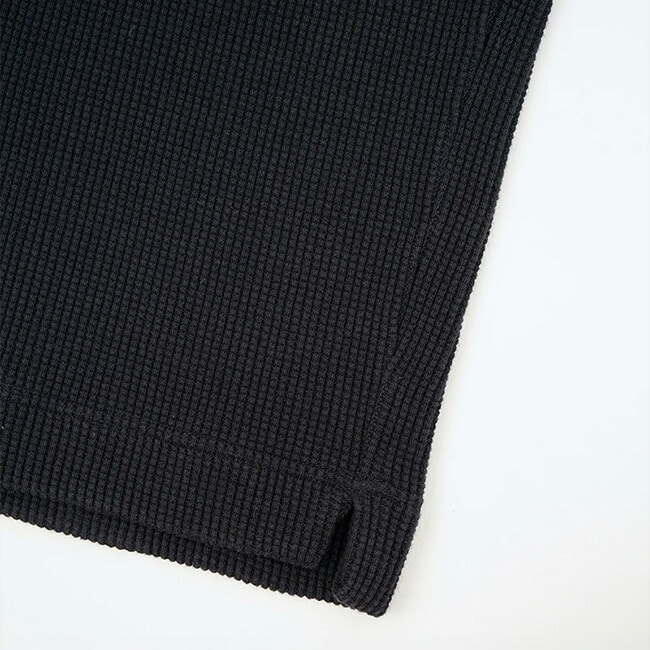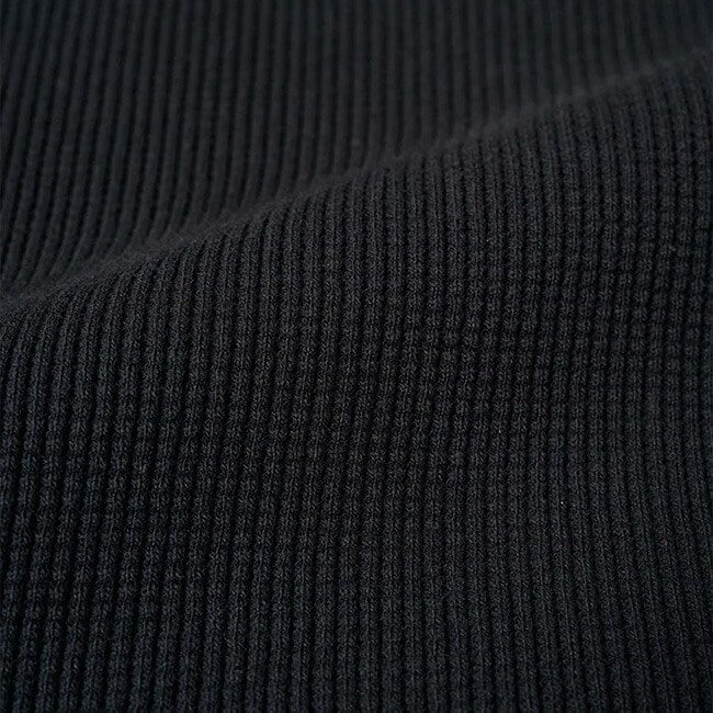 伸びない、ダレないはもちろんミドルゲージのウールニットと同等かそれを凌駕する保温性を付与させた設計。本製品の編地はどこにでもあるワッフルに見えますが、世の中に溢れている安価で単純なワッフル編地とは全く別物です。
