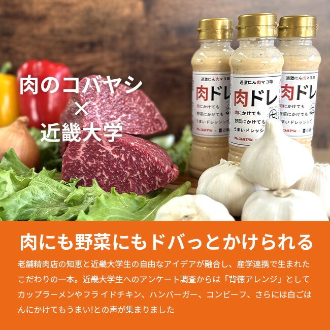 「肉にドレッシングってアリ!?」そんな発想から誕生した、新感覚の万能ドレッシング。老舗精肉店の知恵と近畿大学生の自由なアイデアが融合し、産学連携で生まれたこだわりの一本です。