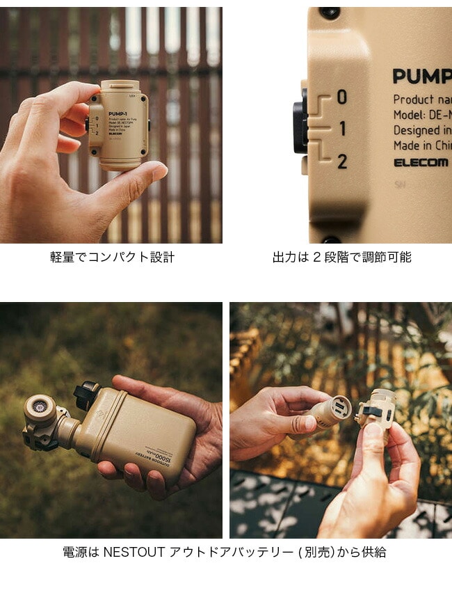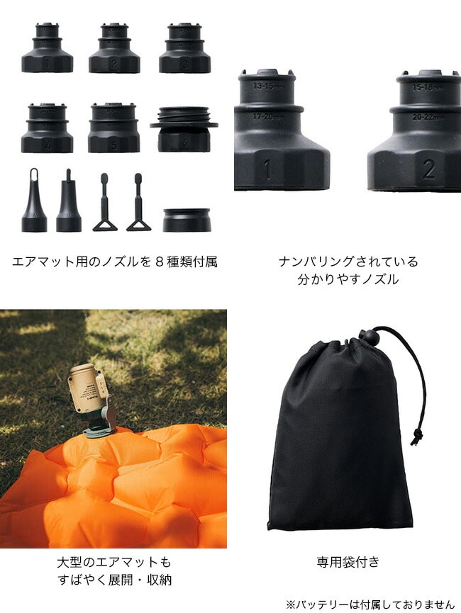 ■付属品:エアノズル8種、空気入れ補助パーツ2個、ネストアウト アウトドアバッテリー接続パーツ、収納袋、取扱説明書