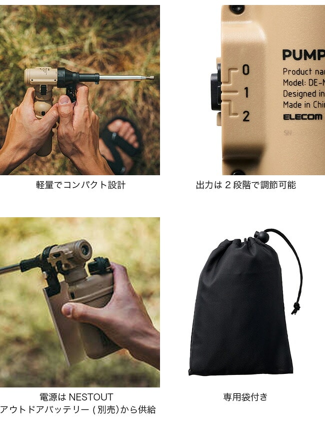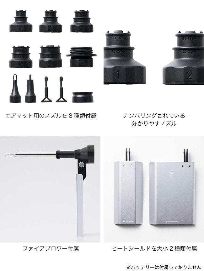 ■付属品:ファイアブロワー、ヒートシールド(M)、ヒートシールド(L)、エアノズル8種、空気入れ補助パーツ2個、ネストアウト アウトドアバッテリー接続パーツ、収納袋、取扱説明書