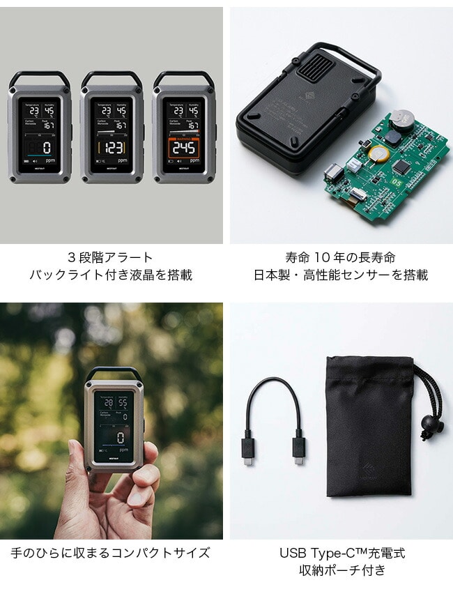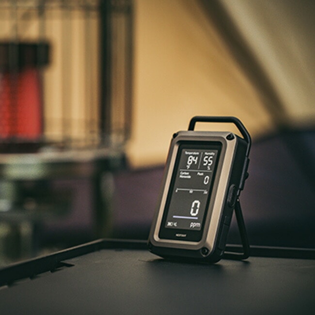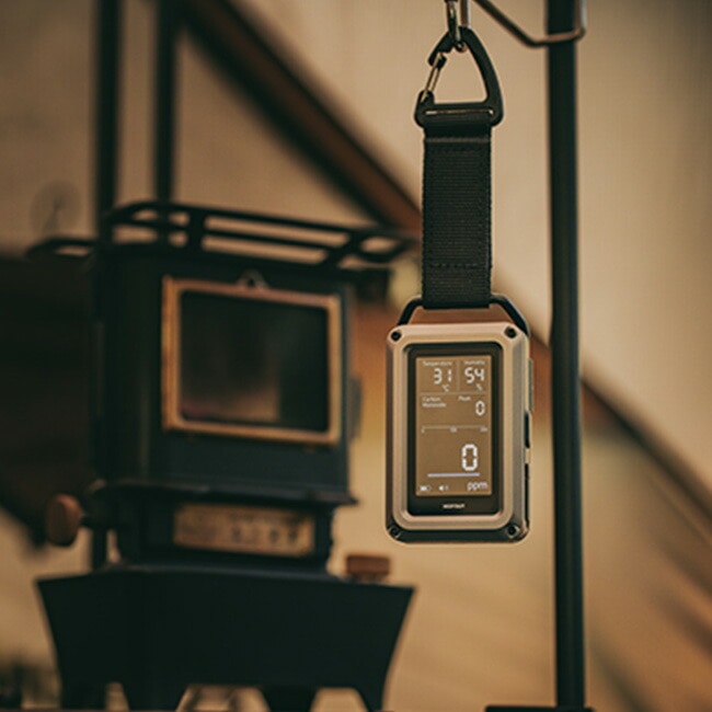炭火やストーブ、発電機などから発生する一酸化炭素(CO)を検知し、アラームでお知らせします。テントやタープ、車内での一酸化炭素中毒(CO中毒)を未然に防ぎます。