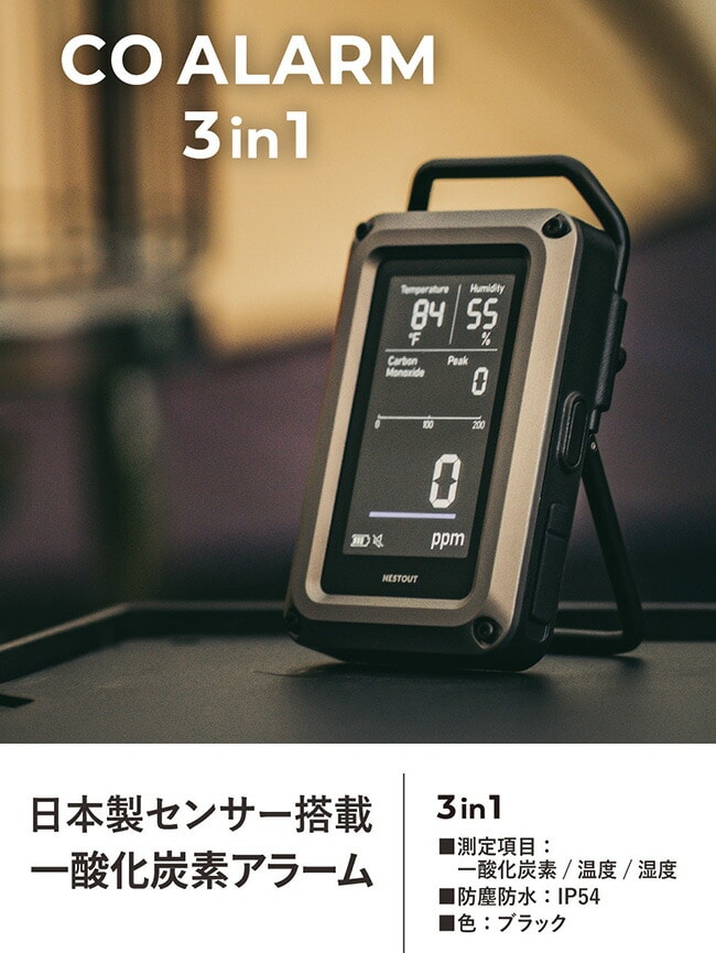 キャンプなどのアウトドアシーンに特化し、温度計と湿度計も搭載した一酸化炭素アラーム