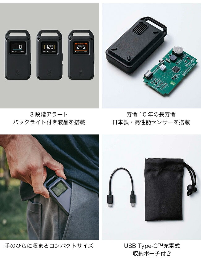 発電機などから発生する一酸化炭素(CO)を検知し、アラームでお知らせします。テントやタープ、車内での一酸化炭素中毒(CO中毒)を未然に防ぎます。
