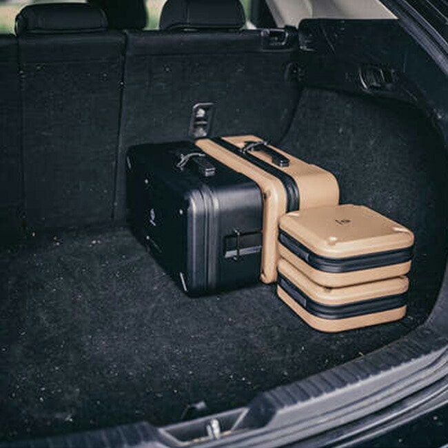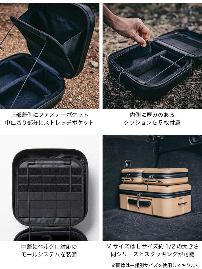 同シリーズのケースとスタッキングが可能で、MサイズはLサイズ約1/2の大きさで、Lサイズの上にMサイズを2つ並べて配置でき、車載時や保管時もスペースを有効に使えます。