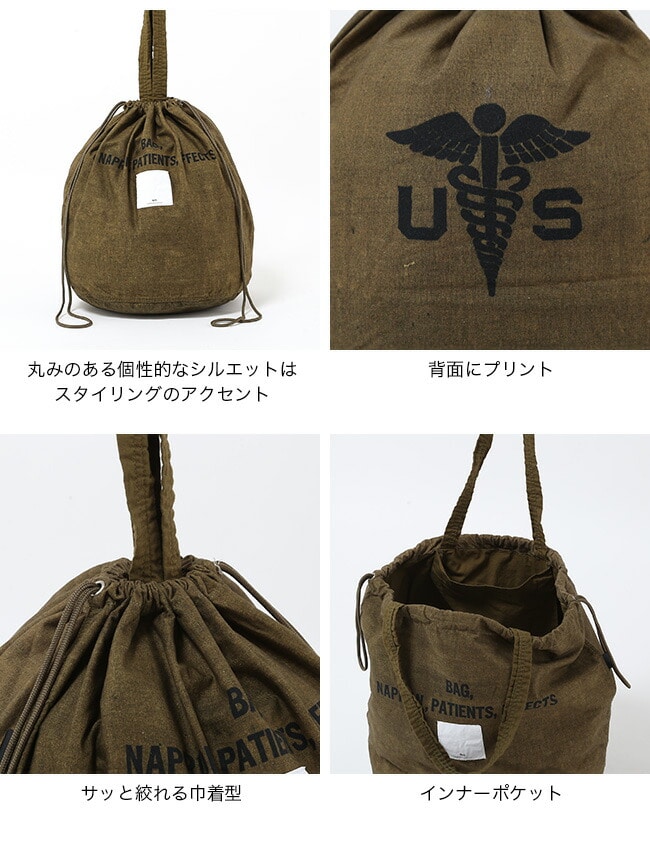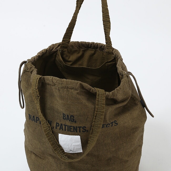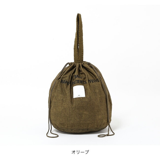 太番手の糸を使って織り上げたミリタリークロスを使用したPATIENTS BAG。身頃部分は2枚仕立ての薄手シーチングで強度を確保し、軽さと丈夫さを両立させました。