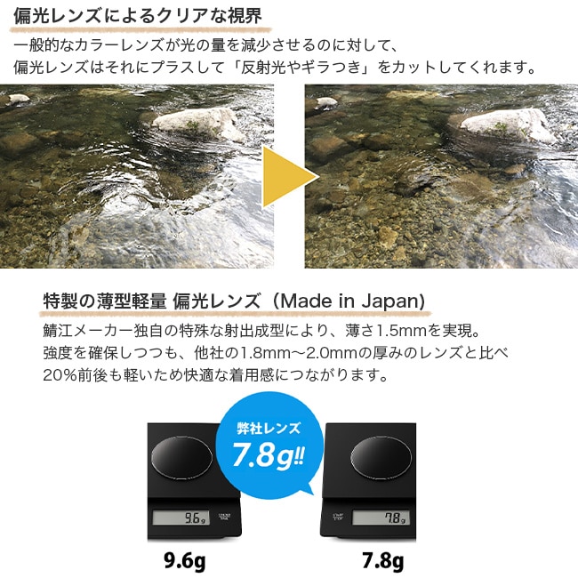 こだわりの偏光レンズと、レンズ自体の薄型軽量化。