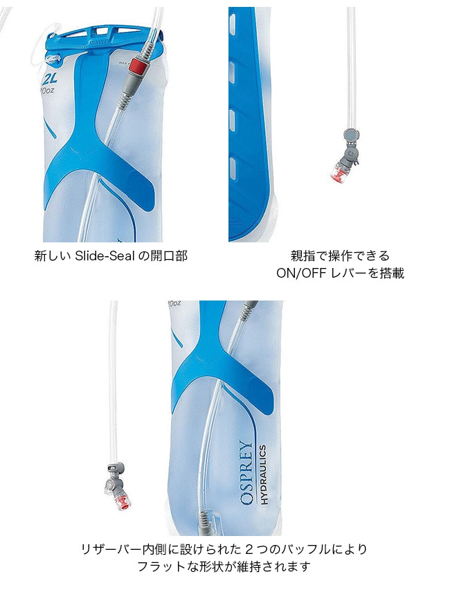 リザーバー内側に設けられたバッフルによりフラットな形状が維持され、かさばらず、しっかりと密閉。