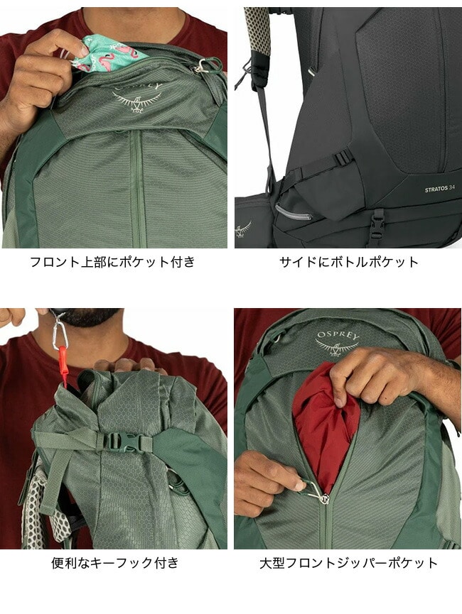 ストラトスはクラシックなデザインに抜群の通気性を融合したハイキングパックの決定版。34はまる1日掛かるデイハイキングまで対応するパネルローダー。