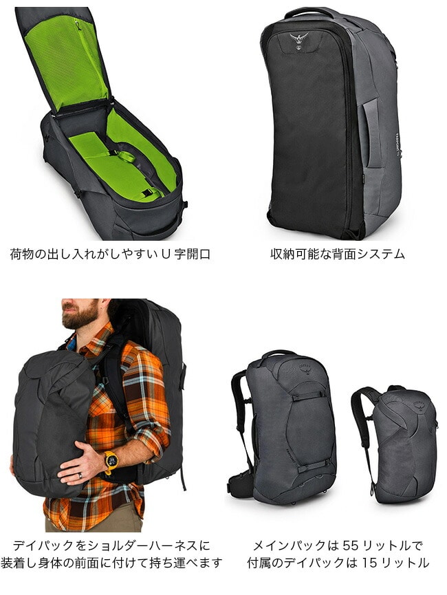 メインパックは55リットルで付属のデイパックは15リットル。付属のファーポイント/フェアビュー トラベルデイパックはデイトリップで使用でき、パック正面にはもちろんショルダーハーネスにも取り付け可能でチェックイン時などでもとても便利です。