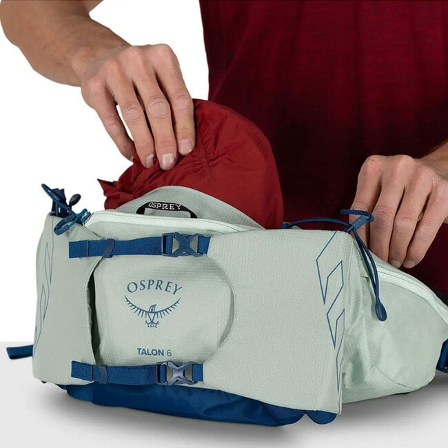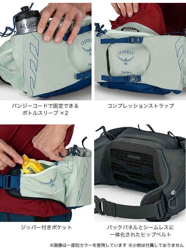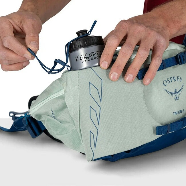 タロン6は、ミニマリストのデイハイカーやトラベラーなど、必要な荷物をコンパクトに持ち運びたい方にぴったりなランバーパックです。左右に備えられたボトルスリーブはバンジーコードが付属しており、ダイナミックな動きでも安定してボトルを持ち運べます。