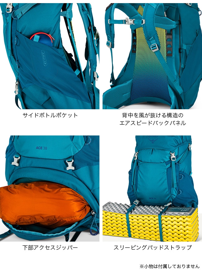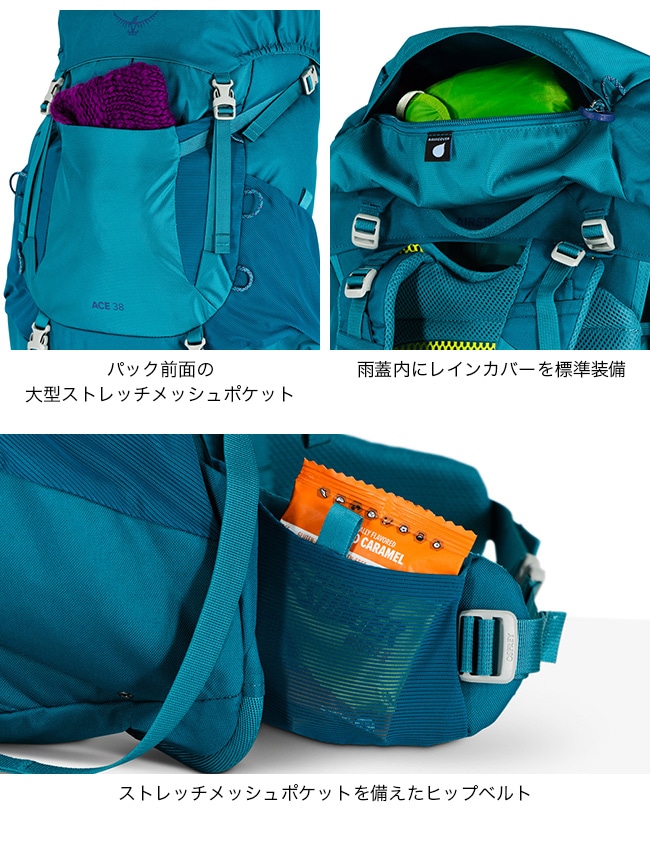 大人向けパックと同等の機能や快適性を備え、若い冒険家の背中に寄り添います。エース38は、小屋泊まりの登山やハイキング、キャンプ、旅行などに適した容量。