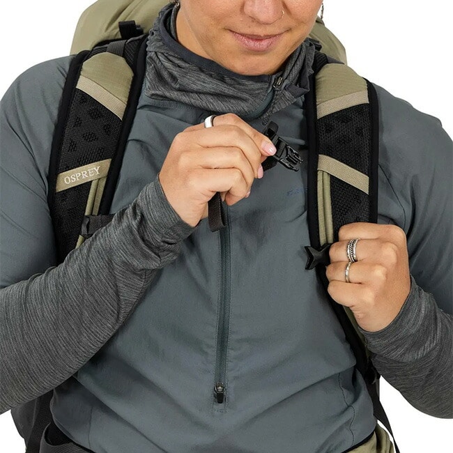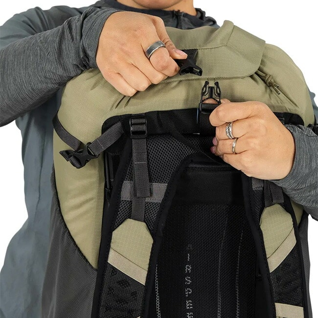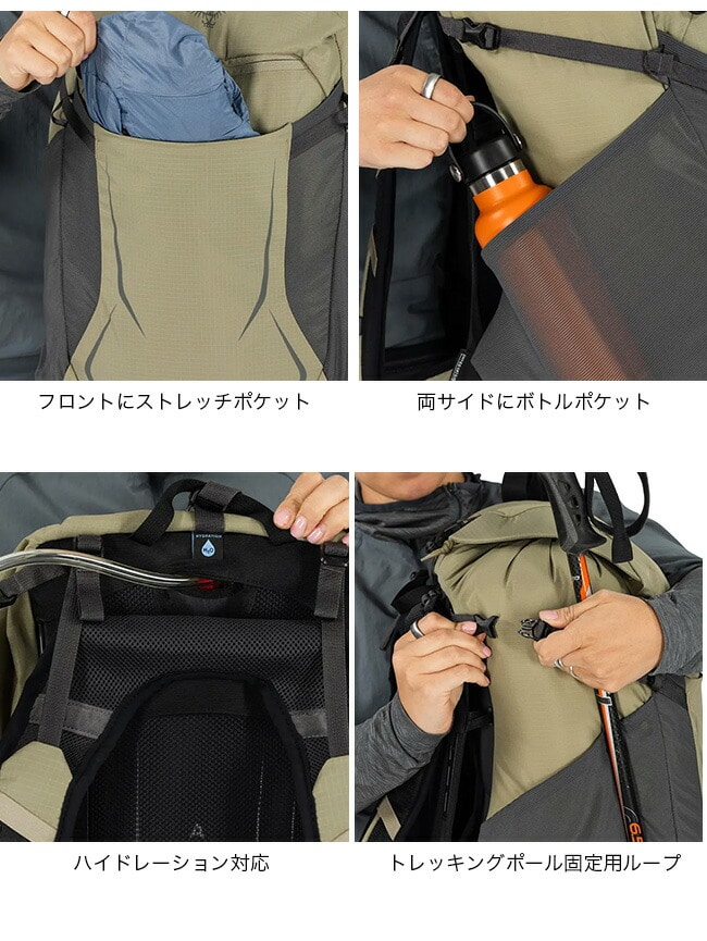 背中から荷重を離しつつ、動きにしなやかに追従するテンションメッシュバックパネルを採用。調整可能なフィット、薄型フラップクロージャー、付属のレインカバー、パッド内蔵ヒップベルトなど、快適機能を満載。