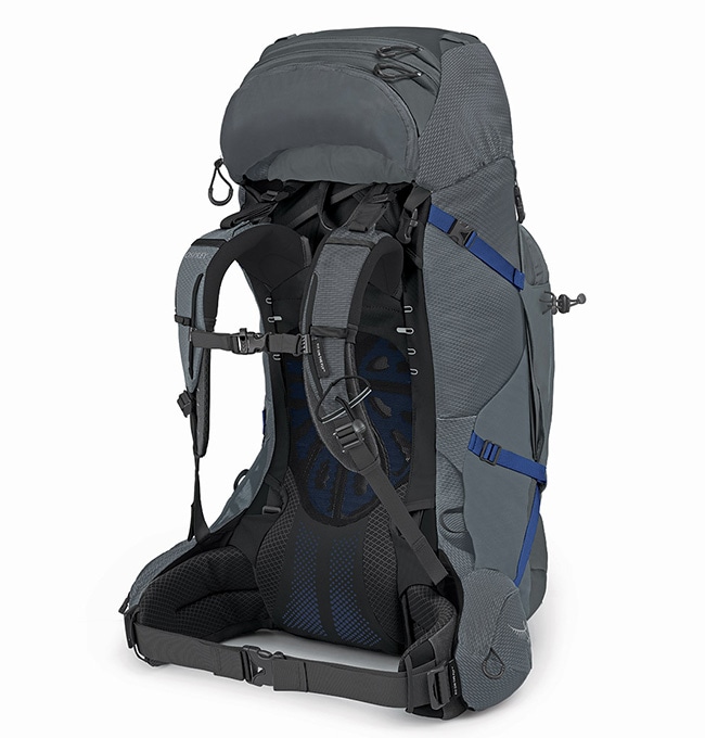ショルダーハーネスとヒップベルトは長さと角度を細かく調節することが可能で、デイパックになる着脱式のトップリッドとレインカバーを標準装備しています。