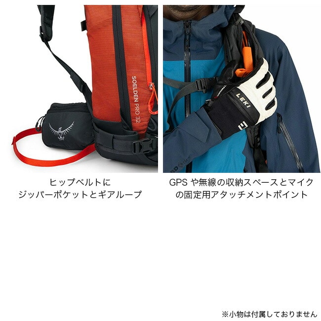 ヘルメットキャリーやスキー/スノーボードアタッチメントポイントなど、雪山に特化した機能を備えています。