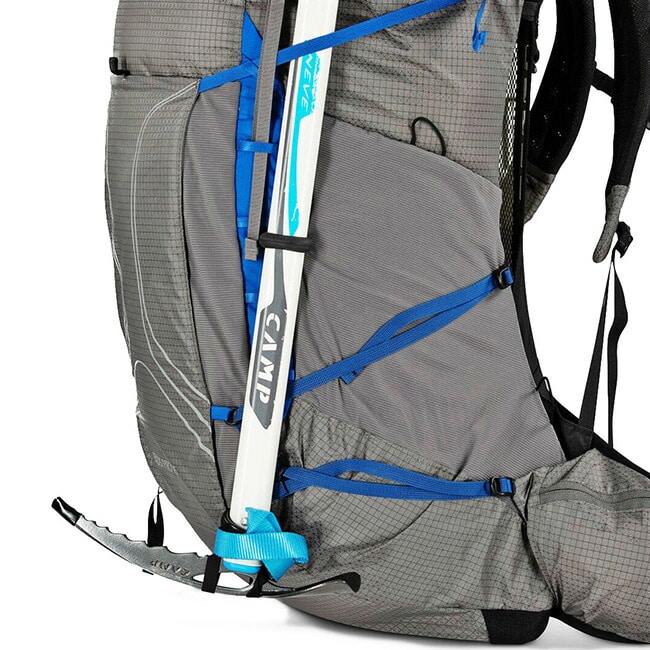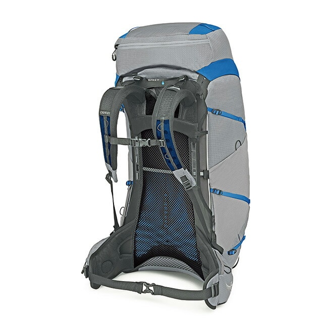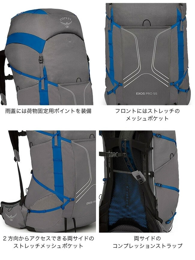 容量55L、パッキングウェイト14-16kgで1kgを切る軽さを実現しています。元々アメリカのスルーハイカー向けに作られたエクソスを、ベアキャニスター(食料を入れるための熊缶)が持ち運べるサイズに再設計した大容量パックです。