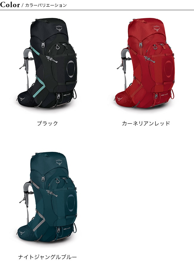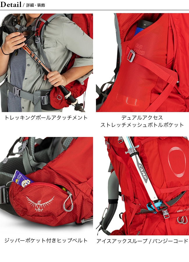 女性の体型にフィットするショルダーハーネスとヒップベルトは長さと角度を細かく調節することが可能で、デイパックになる着脱式のトップリッドとレインカバーを標準装備しています。