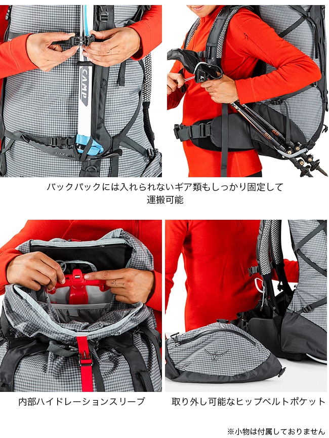 雨蓋やヒップベルトポケット、サイドコンプレッションストラップなどの装備は、取り外して軽量化させることが可能。