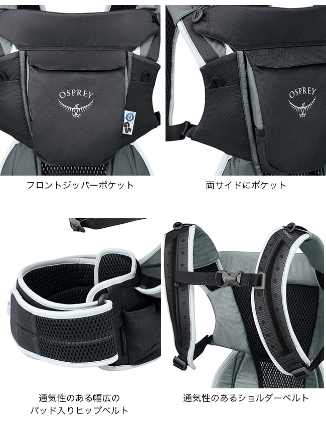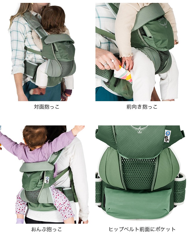 対面抱っこ・前向き抱っこ・おんぶ抱っこと、子どもの成長に合わせて3種類のキャリーポジションが選べます。チャイルドシート、ショルダーベルト、ヒップベルトに3Dメッシュを取り入れて通気性を高め、子どもも大人もムレを軽減。