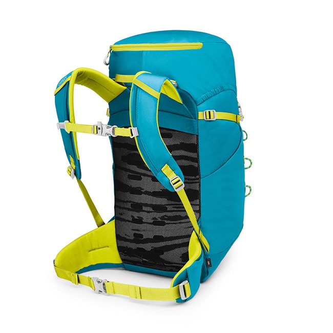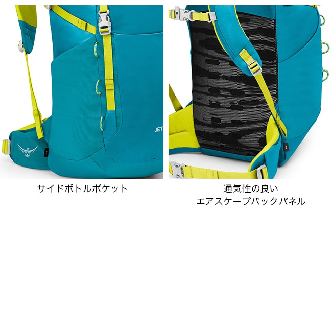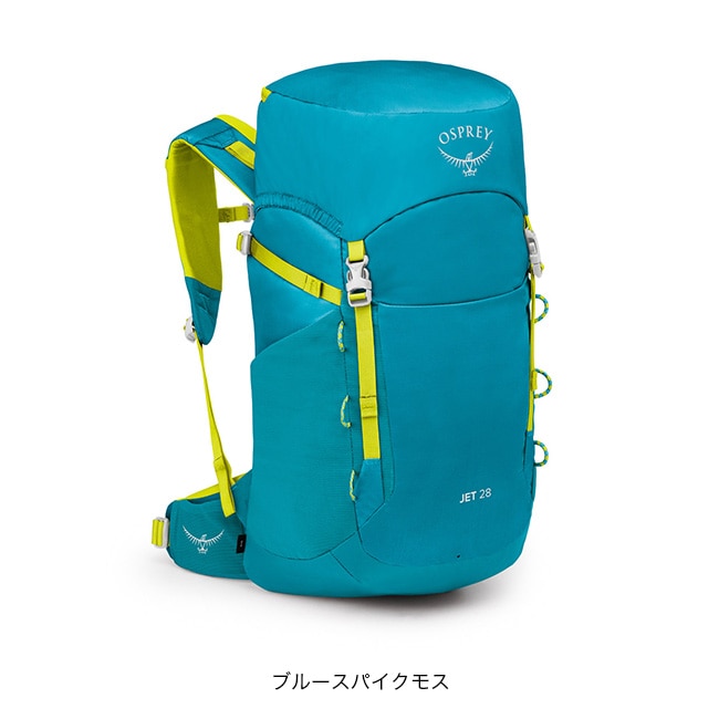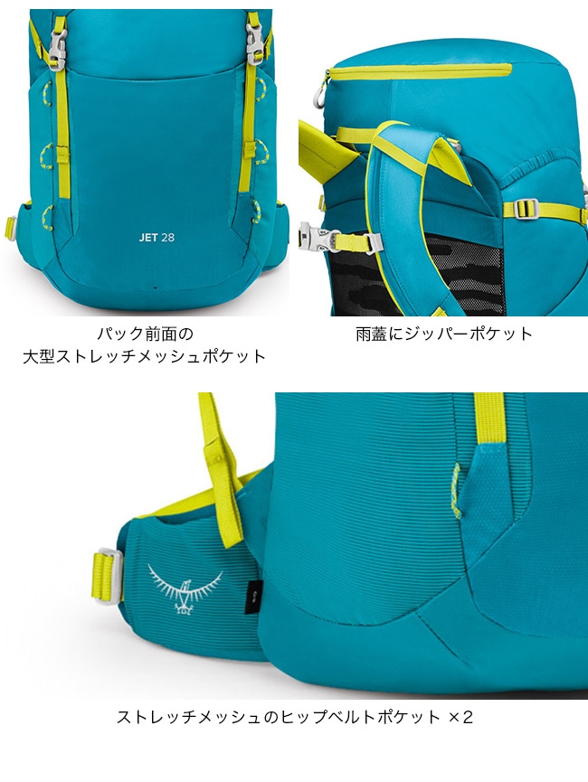 ジェット28はワンデイトラベルやトレイルに必要な着替えやシェル、携帯食を収納できるサイズです。雨蓋やヒップベルト、本体の前面や側面にポケットを備え、行動中も手軽にレインジャケットや水筒、おやつなどを出し入れできます。
