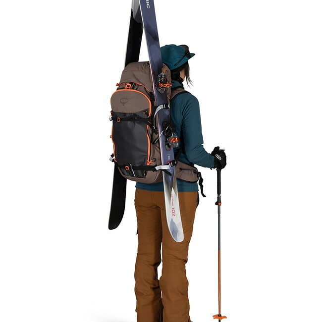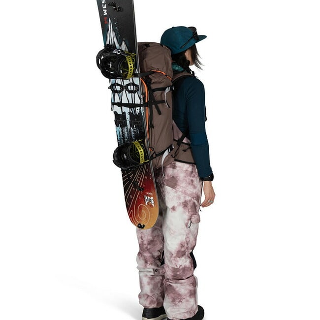 スキーは斜め掛けやAフレームでも装着可能、もちろんスノーボードも装備可能。