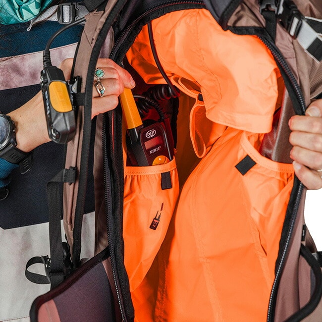 アバランチポケットには目立つカラーのジッパーを採用し、緊急時でもアバランチギアへの直感的なアクセスが可能です。