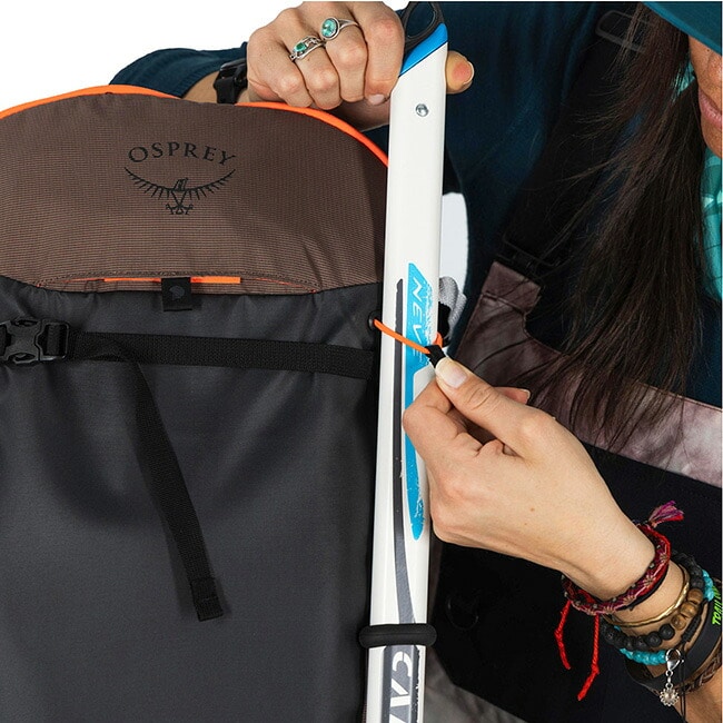 スキーは斜め掛けやAフレームでも装着可能、もちろんスノーボードも装備可能。