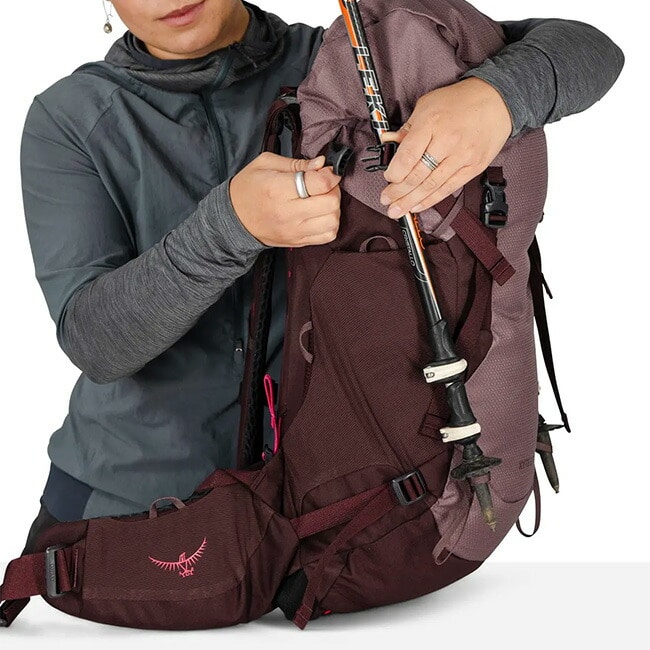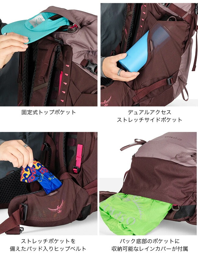 メイン荷室の上部にはトップリッドを備えるほか、ヒップベルトポケットに必需品を収納できます。