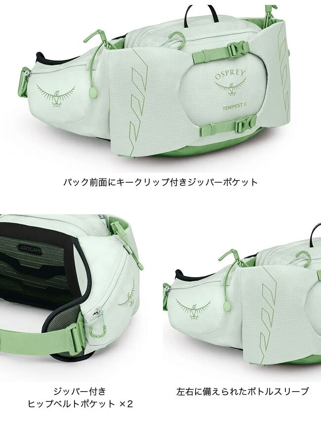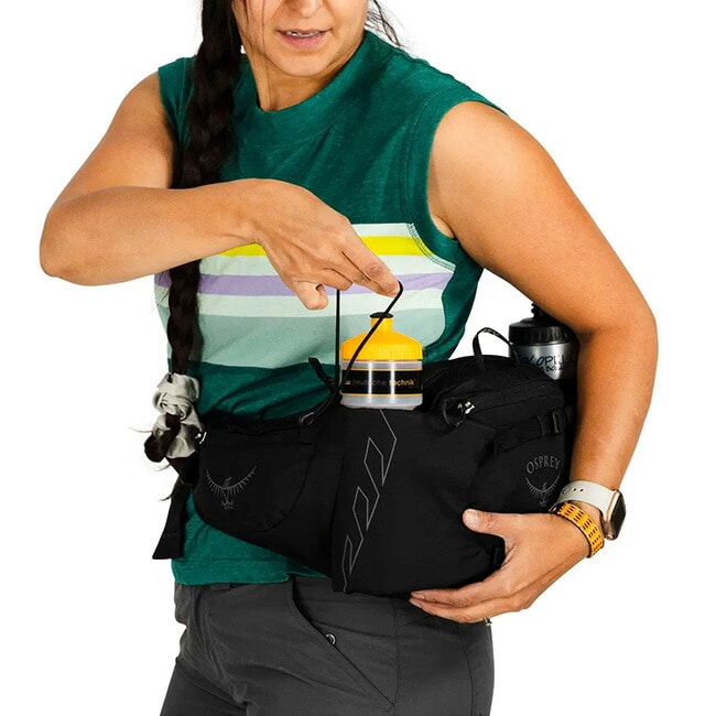テンペスト6は、ミニマリストのデイハイカーやトラベラーなど、必要な荷物をコンパクトに持ち運びたい方にぴったりなランバーパックの女性向けモデルです。左右に備えられたボトルスリーブはバンジーコードが付属しており、ダイナミックな動きでも安定してボトルを持ち運べます。
