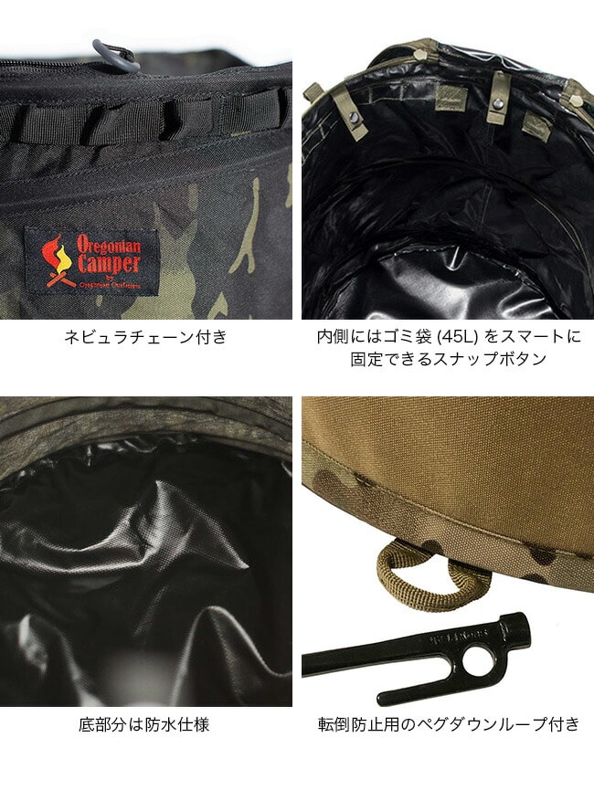 内側にはゴミ袋(45L)をスマートに固定できるスナップボタン、外側には便利なネビュラチェーンが付いています。