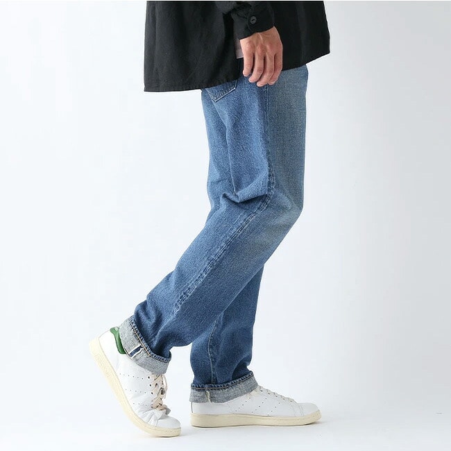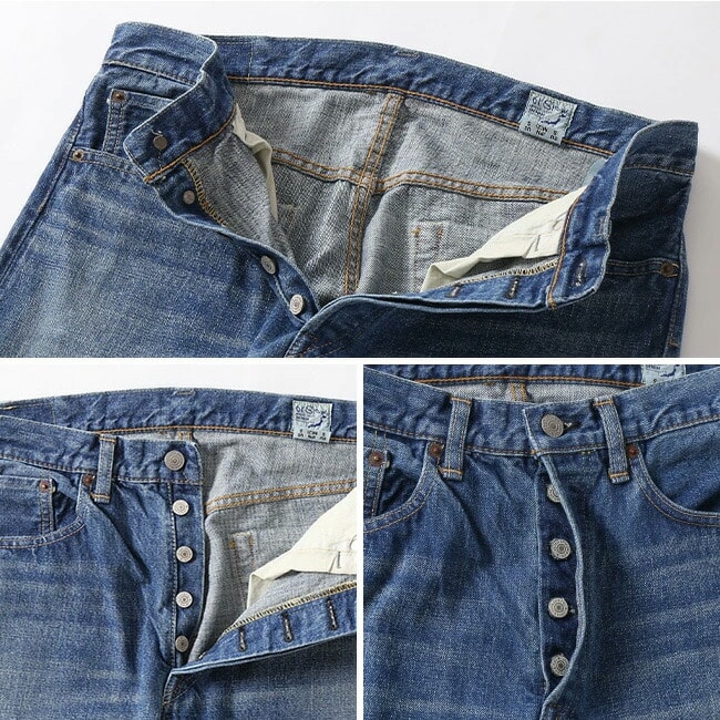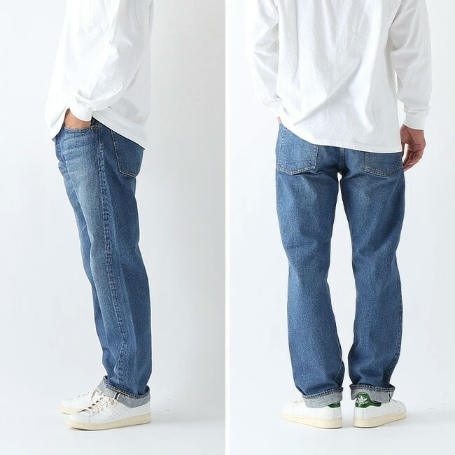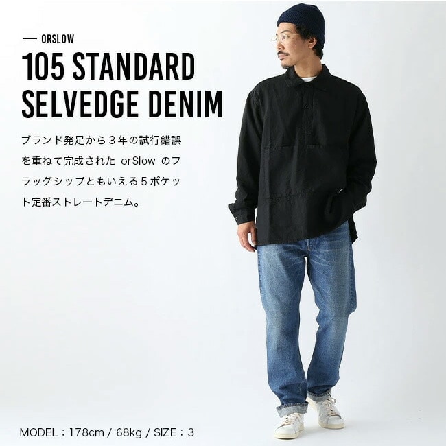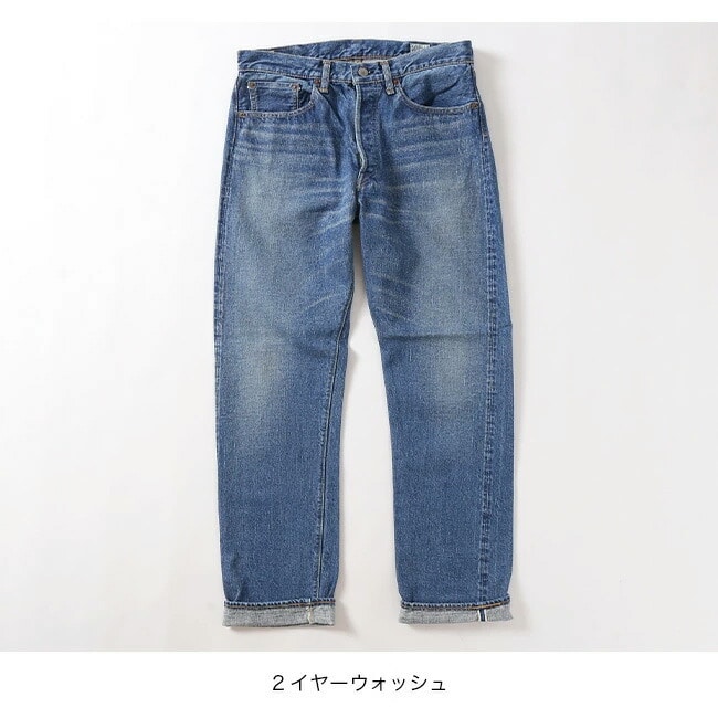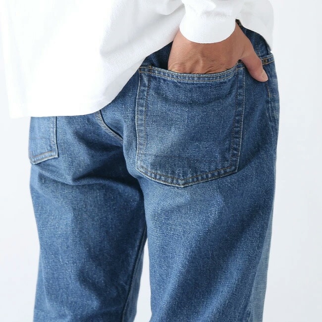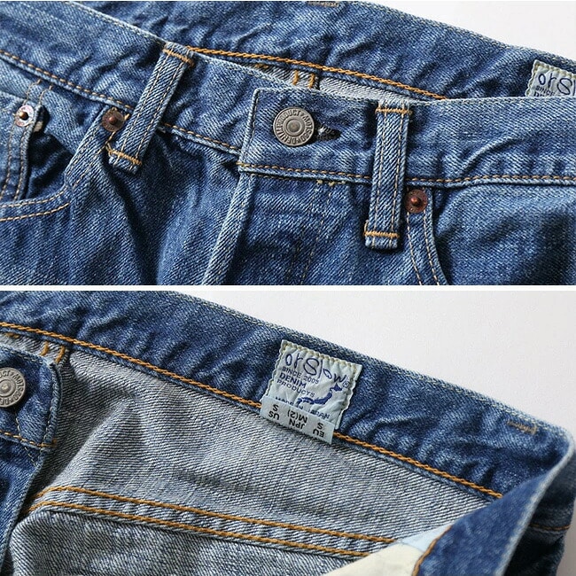 ブランド発足から3年の試行錯誤を重ねて完成されたorSlowのフラッグシップともいえる5ポケット定番ストレートデニム。細すぎず、太すぎない着回しのきくシルエットでフロントはボタンフライ。