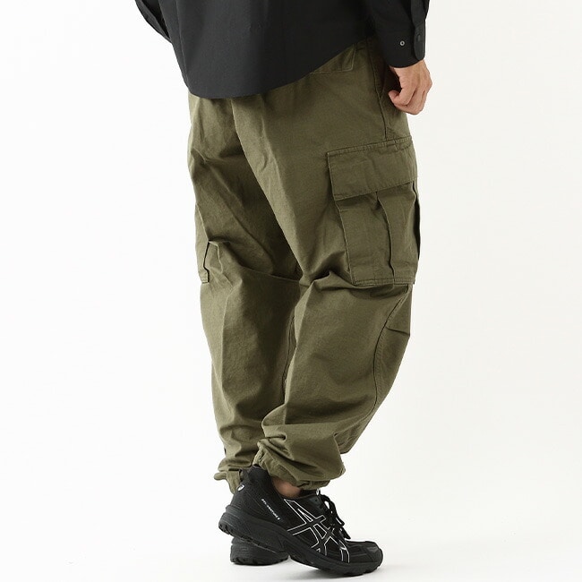 60年代のベトナム戦争時に採用された「ジャングルファティーグ」をベースにデザインされており、太めのシルエットが特徴。サイドの大きなタック入りポケットや、裾の丸紐ドローコードなど、当時のディテールを随所に取り入れています。