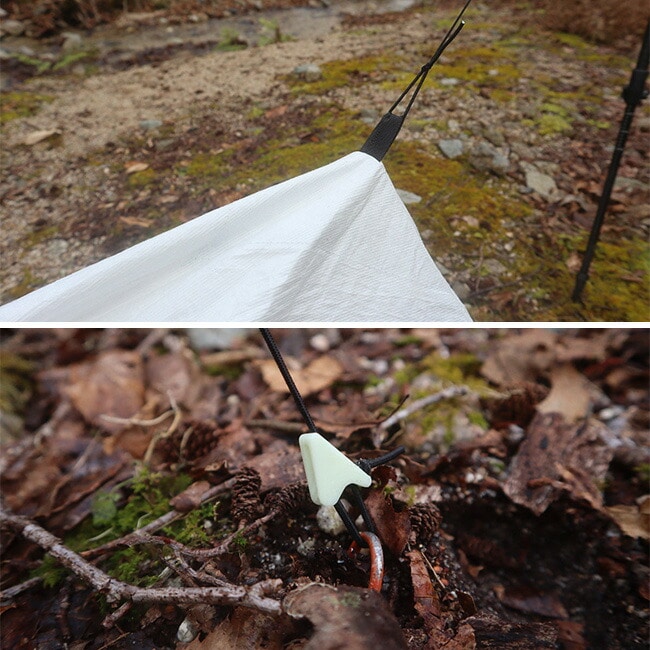自立型テントとしてアクティブに使用していただくために、テントの頂点部分には2箇所にバンジーコードが付いており、立木やトレッキングポールに取り付けることでビビィテント内のスペースを拡張することができます。