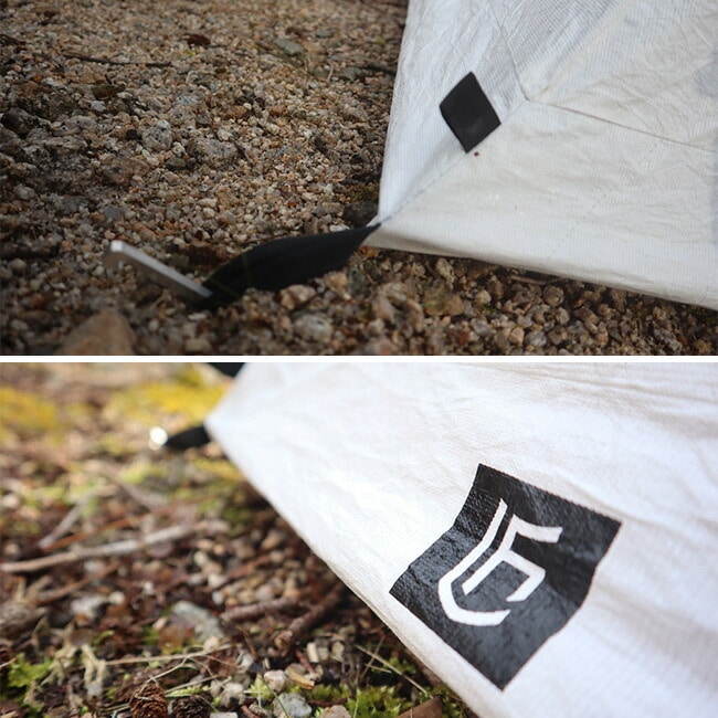 ダイニーマ生地は、ペグダウンポイントの下部の 4 つの角と、バンジーコードが取り付けられている 2 つの頂点など、生地に負担がかかることが多い部分の補強に使用されます。