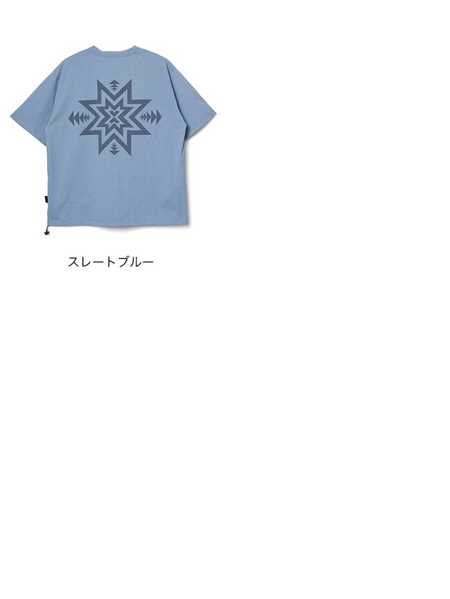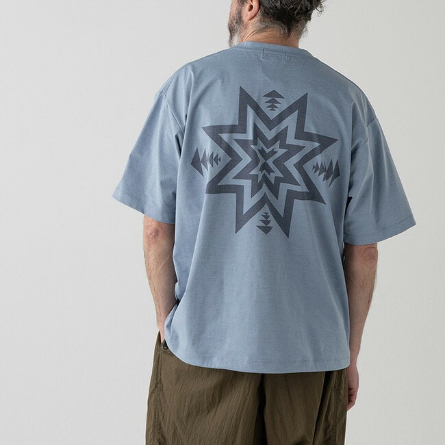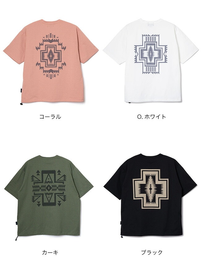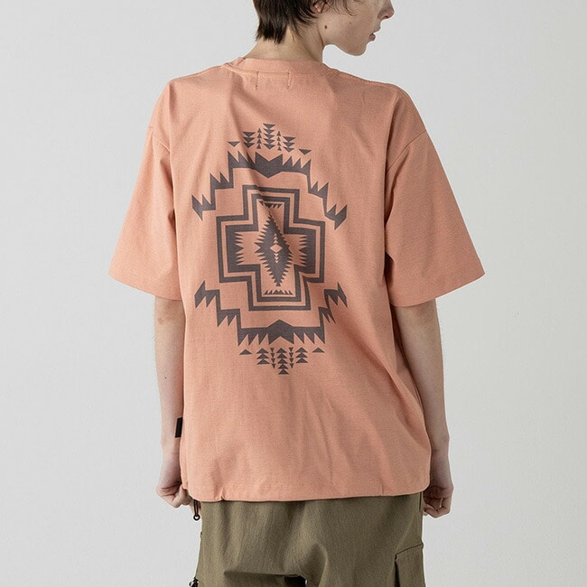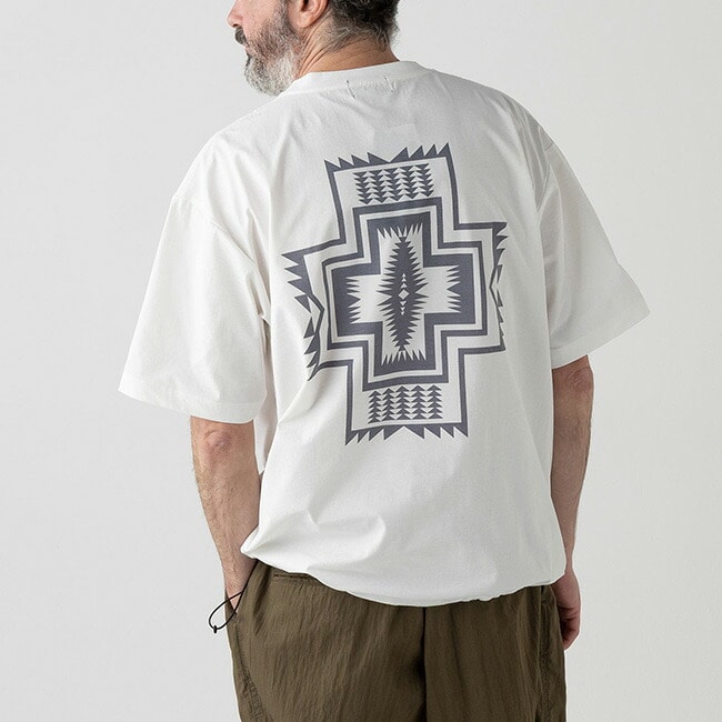 Pendletonのブランケットパターンを大胆にバックプリントで表現した、シンプルながら存在感のあるTシャツ。帝人が開発したCALCULO糸とSOLOTEXを組み合わせた高機能天竺素材を採用し、軽さと通気性に優れた快適な着心地を実現しています。